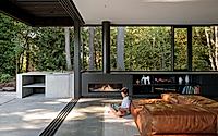 The interior aesthetic combines modern lines with warm wood accents, fostering an inviting atmosphere. The exterior, featuring black metal and warm wood siding, reflects the thoughtful blend of spaces inside.