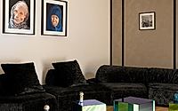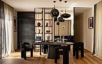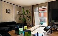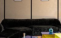 In Naples, Italy, Carmine Abate designed House Luigi Ganzerli in 2022. The project contrasts layers of warm tones with cool grey and black hues to create a dramatic composition. A long corridor extends through most of the floor plan, directing occupants toward a circular antechamber lined with wooden sliders. A grand living space sits at one end of the residence and contains multiple areas delineated by varied flooring styles, including a striking black stone rug with triangular cutouts.