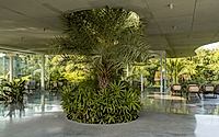 Transparency and sustainability define its architecture; the four glass cubes allow natural light to flood the spaces, fostering openness and connection to the surrounding gardens. The emphasis on natural materials promotes local economy support and energy efficiency.