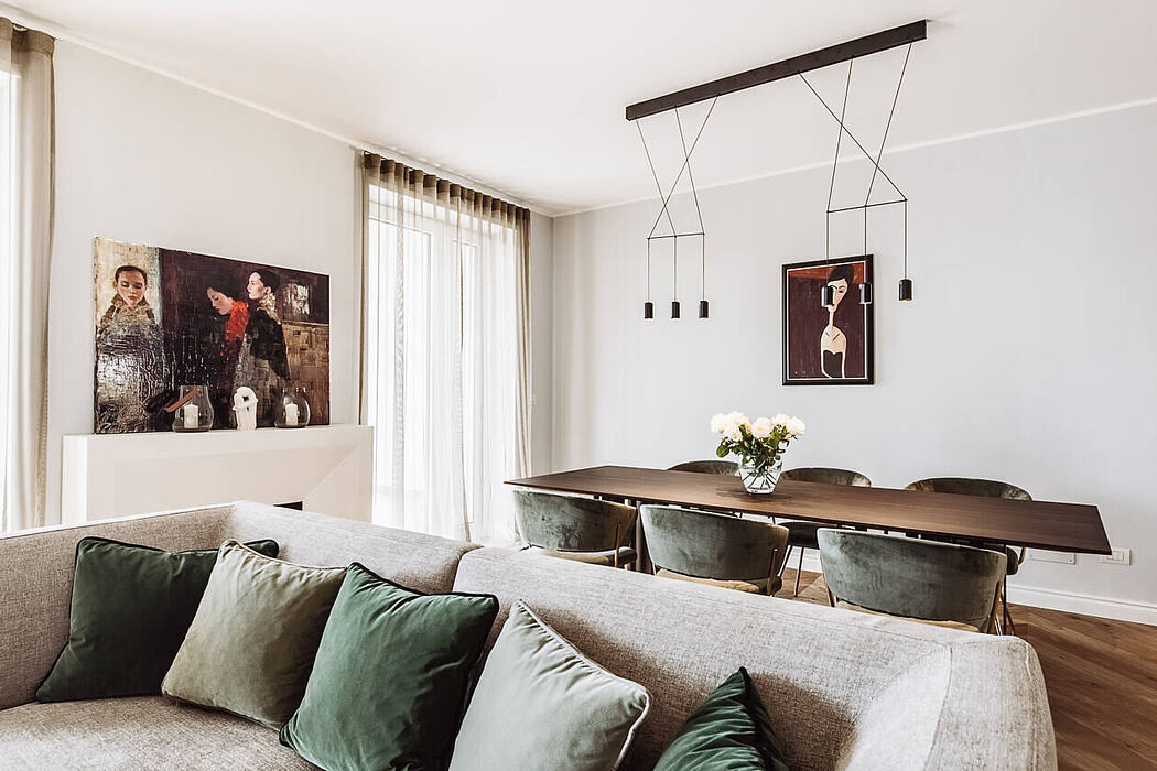 Every corner of this dwelling tells a story, with retro, ethnic, and vintage elements adding a personal touch to the apartment’s modern design style. Featuring elegant salvia green walls, custom furnishings, and playfully contrasting materials like velvet and wood, this property exudes a warm mood that truly sets it apart.