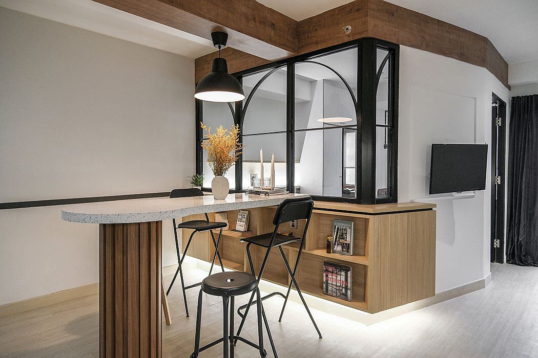 This apartment’s design is a perfect balance between industrial and rustic styles, inspired by the natural warmth of a farmhouse. The designers incorporated a natural color palette with diverse tones of wood and edgy black furniture accents to create a well-aged and vintage look.
