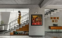 The house, located in Bengaluru, India, is designed by Kamat & Rozario Architecture. Envisaged as a large concrete tray placed in relation to the sun’s movement, the residence opens itself up to a more climatically pleasant aspect in the form of an open court, serving as the heart and lung of the house. Features include layering materials and textures on the southern facade to respond to sunlight, as well as top-lit stairs.