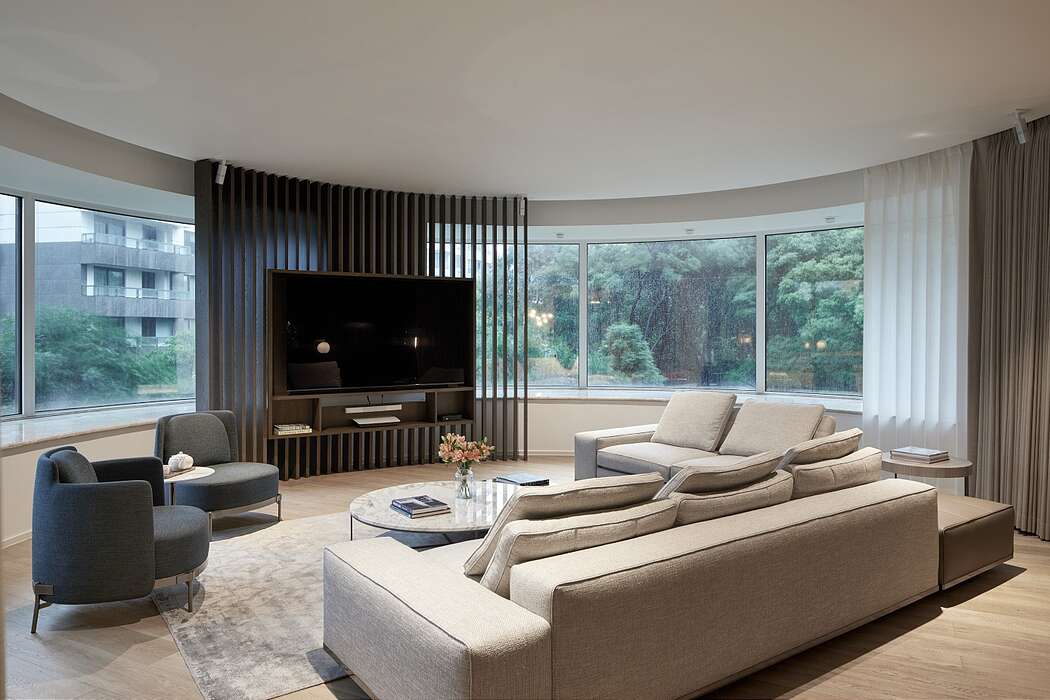 The clients, a Chinese husband and European wife, sought a peaceful respite from the bustling city, and the resulting design delivers with its thoughtful division of private and public areas, and the integration of the clients’ global travel collections.