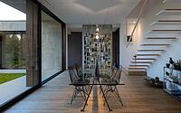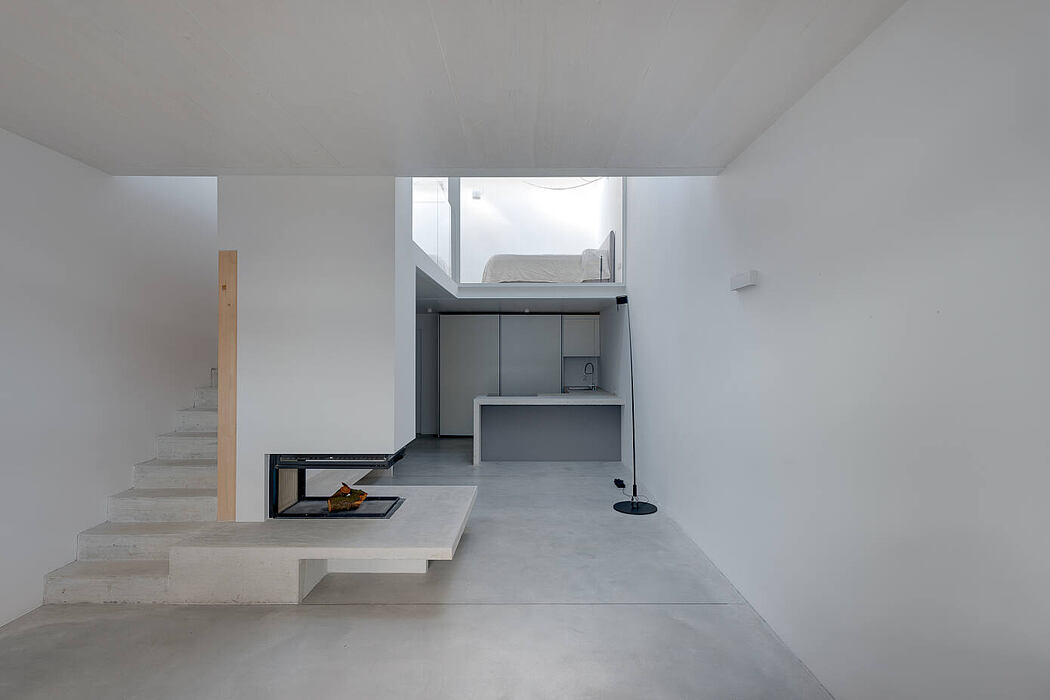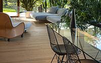 The exterior of the house is marked by precise geometries and exposed concrete with a formwork bottom effect, while the interior spaces are linear and highly functional. The cantilevered staircase leads to the upper floor, where the resting places overlook the garden. The texture of the surfaces and minimal design of the furniture complement the floridity of the surrounding vegetation.