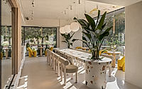Bonne Bouche is a vibrant confectionery café located in Mohyliv-Podil’s’kyi, Ukraine. Designed by YOD Group, the café features a bright facade that opens up to the street, while the space inside incorporates urban elements like a stepped podium and rounded furniture. The interior style employs Italian terrazzo and graphic lighting that changes throughout day, creating a unique atmosphere intended to evoke personal experiences and emotions connected to food.
